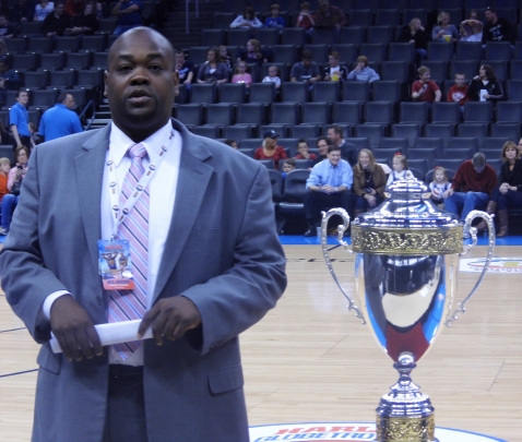 Either way it was a nice "story line" and the trophy they were "competing for" was a very nice and impressive one. The kid my friend brought was very impressed by it, so props to whoever designed it. I got a good picture of it with the games D.J. He was nice enough to pose with it for me as I went to take a picture before we took our seats.